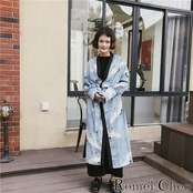 RomelCheo 水色鶴柄カーディガン 羽織り ロング丈 ゆったり 長袖 和柄 和風 ジャケット ライトアウター 総柄 コーディガン 日焼け対策 冷房対策 秋口 モード系 和装 浴衣 法被 ガウン レディース 原宿系 ストリート ロメルチェオ