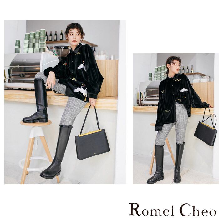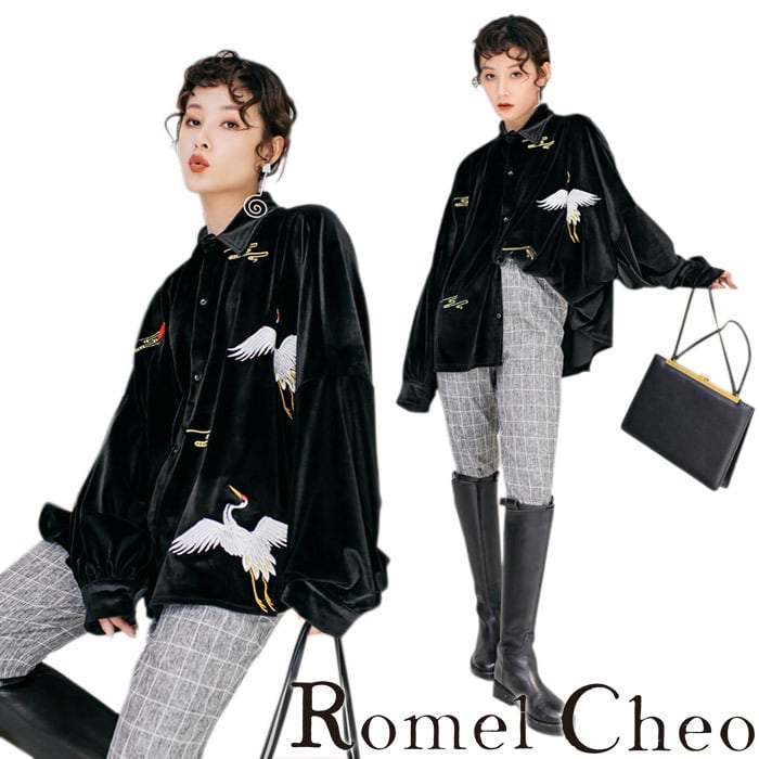 RomelCheo スエード鶴柄刺繍シャツ 和柄 和風 長袖 ゆったり トップス 羽織り ドロップショルダー オーバーサイズ エスニック カジュアル ガーリー モード 原宿系 青文字系 ファッション ロメルチェオ
