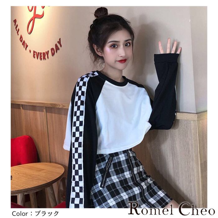 RomelCheo チェッカーフラッグシャツ 長袖 ショート丈 ゆったり ロンT Tシャツ サイドライン ドロップショルダー パンク ロック ストリート 市松模様 青文字系 原宿系 レディース ファッション カジュアル ロメルチェオ
