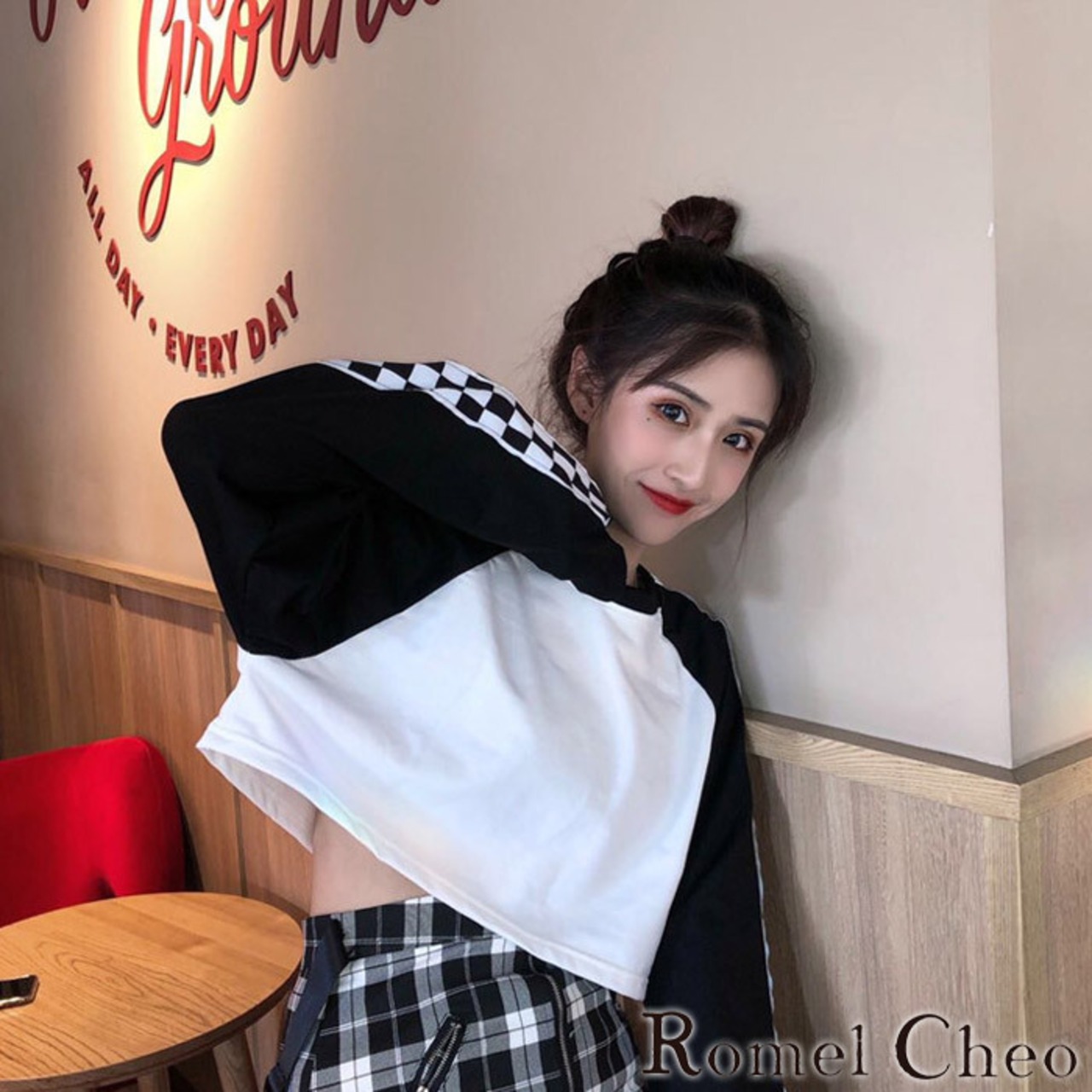 チェッカー柄でストリート感強めですが、ショート丈で女の子らしさも忘れずにプラス♪