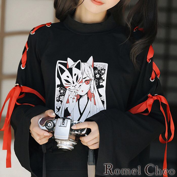 RomelCheo 編み込みフレアスリーブトレーナー スウェット ロリータ ゆめかわいい 和風 アジアン レディース トップス カジュアル おしゃれ 病みかわ 青文字系 ロメルチェオ 原宿 ストリート