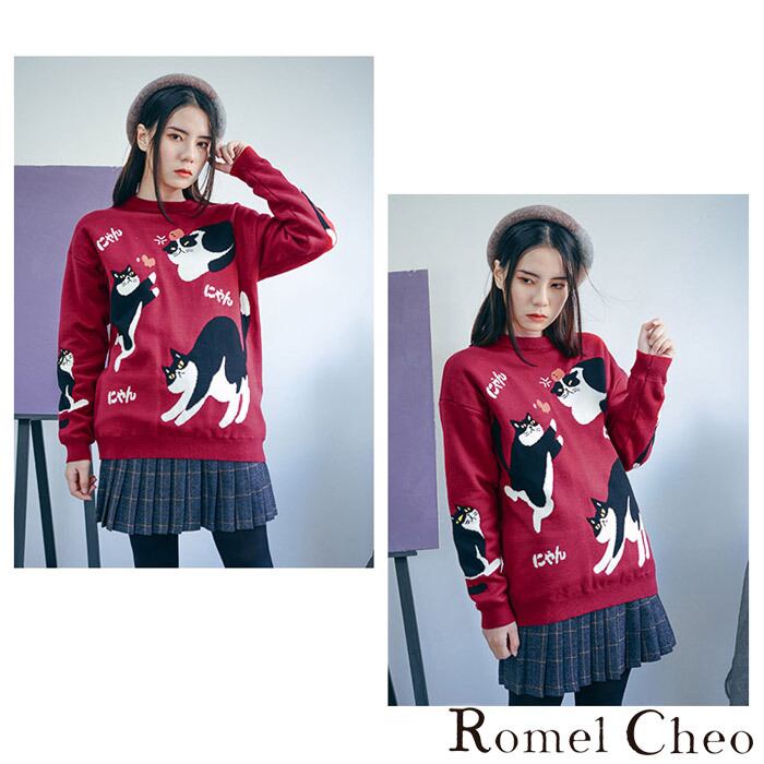 RomelCheo にゃんにゃんニット セーター ニットウェア 長袖 プルオーバー 猫柄 クルーネック 丸首 ロリータ ゆめかわいい 個性的 癒し ほのぼの 可愛い 原宿系 青文字系 レディース ファッション カジュアル ロメルチェオ