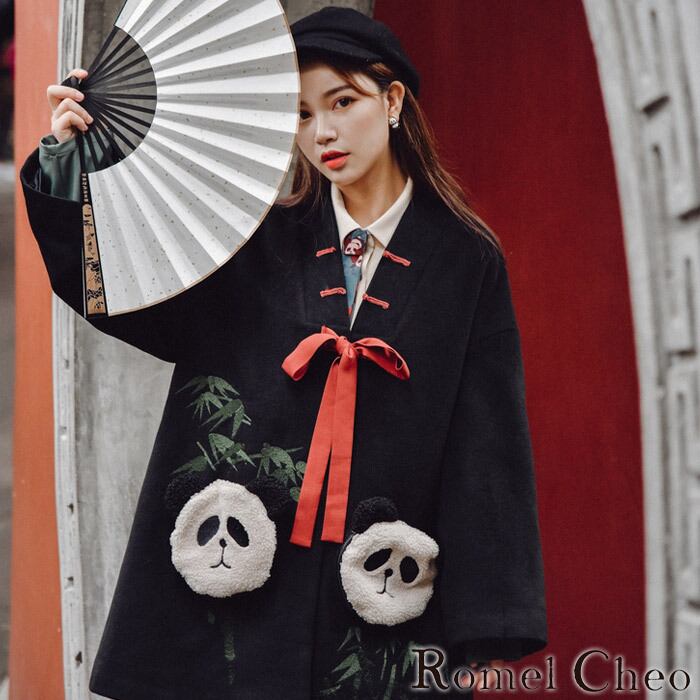 【お支払い確認後20日以内発送】 RomelCheo パンダボアジャケット 羽織り コート アウター はんてん ブルゾン 長袖 和風 アジアンテイスト 漢服 熊猫 可愛い 個性的 チャイナ風 原宿系 レディース ストリート系 青文字系 ファッション ロメルチェオ