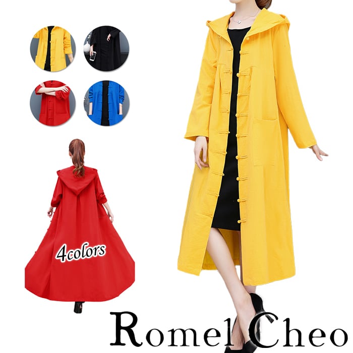 【お支払い確認後20日以内発送】 RomelCheo チャイナ服 パーカー ミモレ丈 コート フード付き カーディガン チャイナボタン ロング丈 レディース aライン 膝下 長袖 薄手 きれいめ カジュアル 黒 原宿系 アジアン エスニック ファッション オシャレ ロメルチェオ
