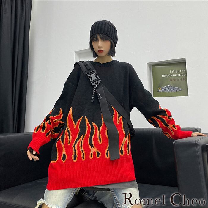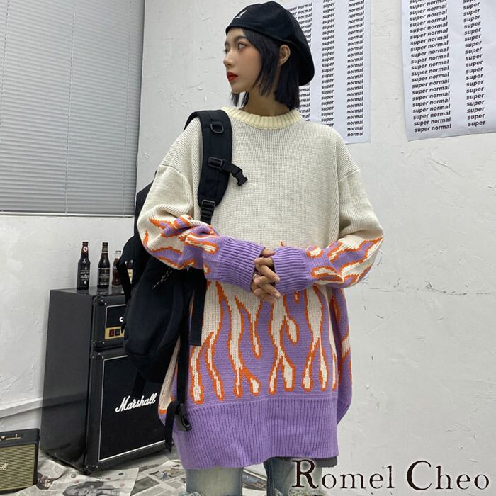 RomelCheo ファイヤーニット オーバーサイズ ビッグサイズ ルーズシルエット ロック パンク ストリート 柄 ファイヤーパターン 個性的 原宿系 青文字系 ロリータ ガーリー カジュアル レディース ファッション カジュアル ロメルチェオ