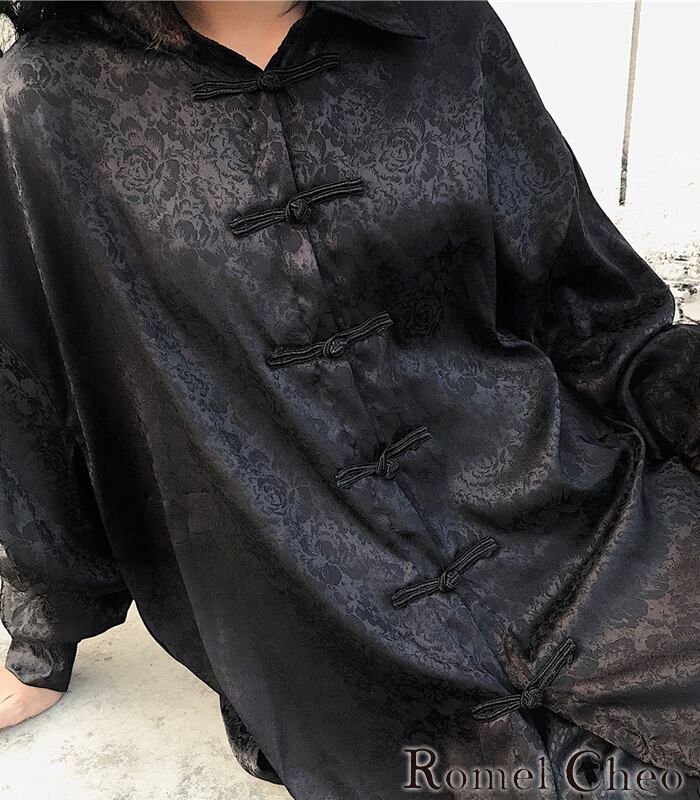 【お支払い確認後20日以内発送】 RomelCheo 襟付きチャイナシャツ モントーン 花柄 モード 長袖 漢服 チャイナボタン 羽織り オーバーサイズ ゆったり カジュアル チャイナ風 B系 韓国 原宿系 レディース ストリート系 青文字系 ファッション ロメルチェオ