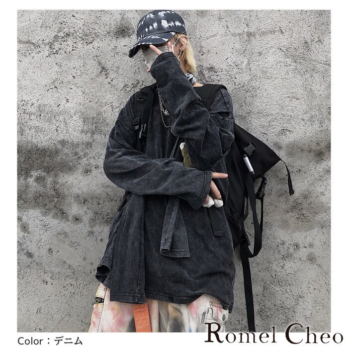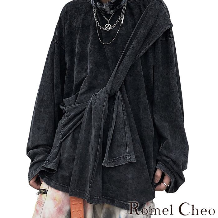 RomelCheo 袖かけモノクロシャツ オーバーサイズ ビッグシルエット ロンT 長袖 カットソー メンズ モード ストリート カジュアル ファッション 無地 ドロップショルダー 個性的 韓国 原宿系 カジュアル ロメルチェオ