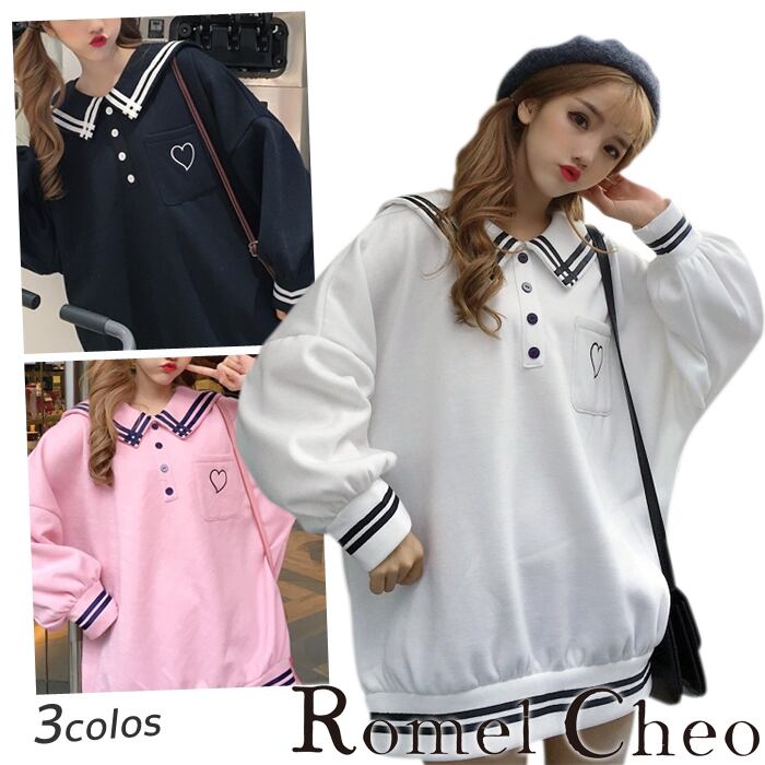 RomelCheo 制服風トレーナー スウェット ビッグシルエット オーバーサイズ ロリータ ガーリー 夢かわ 病みかわ 青文字系 森ガール 長袖 カジュアル セーラー服風トレーナー 個性的 韓国 原宿系 ロメルチェオ