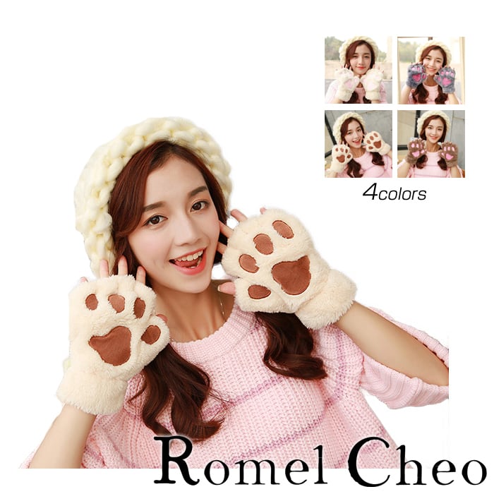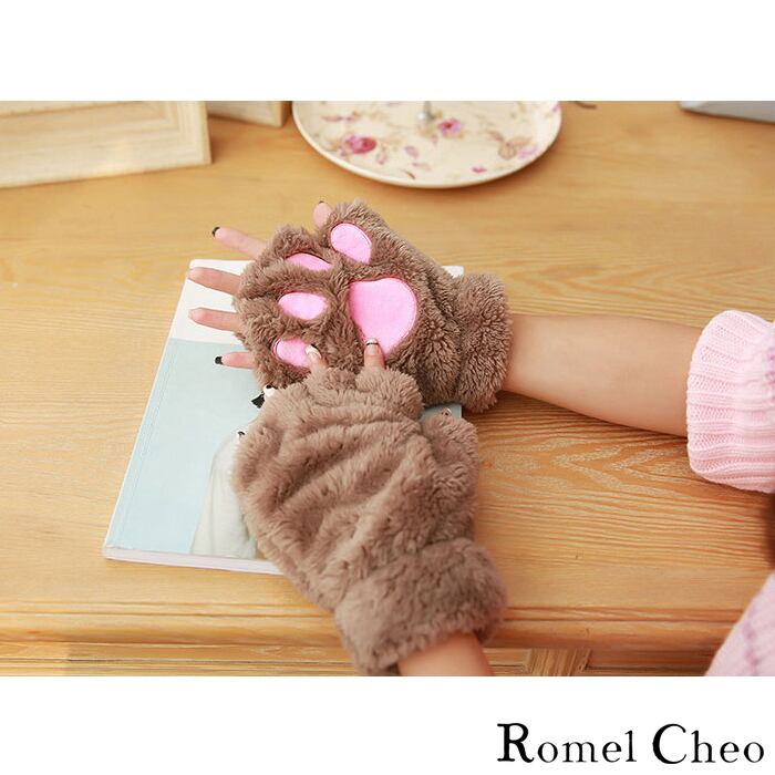 RomelCheo 指なし 手袋 レディース かわいい スマホ対応 肉球 猫 ボア 裏起毛 防寒 もこもこ モコモコ アニマル グローブ 猫の手 仮装 グッズ コスプレ 暖かい 原宿系 ロメルチェオ
