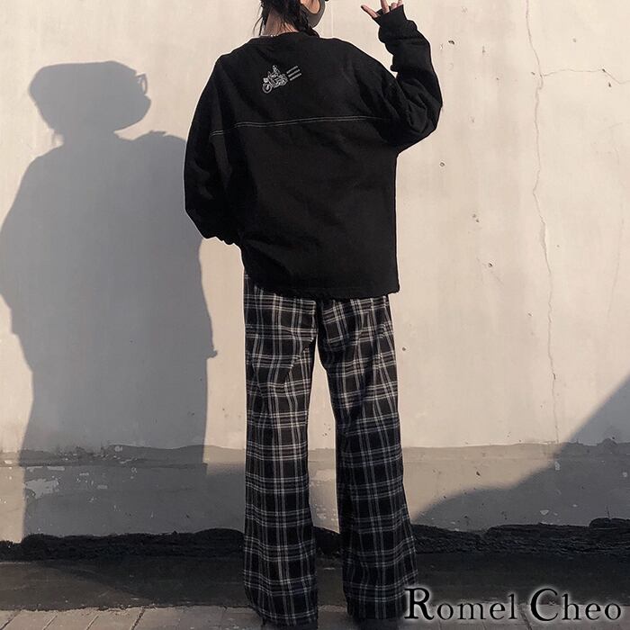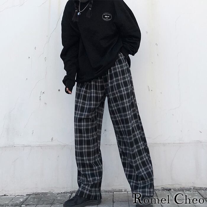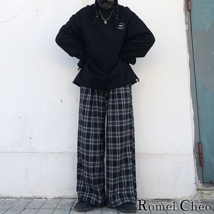 【お支払い確認後20日以内発送】RomelCheo ブラック チェック ワイド パンツ タータンチェック 格子柄 レディース メンズ ユニセックス 黒 モノトーン ビッグシルエット ゆったり ストリート 韓国 カジュアル ファッション ロメルチェオ