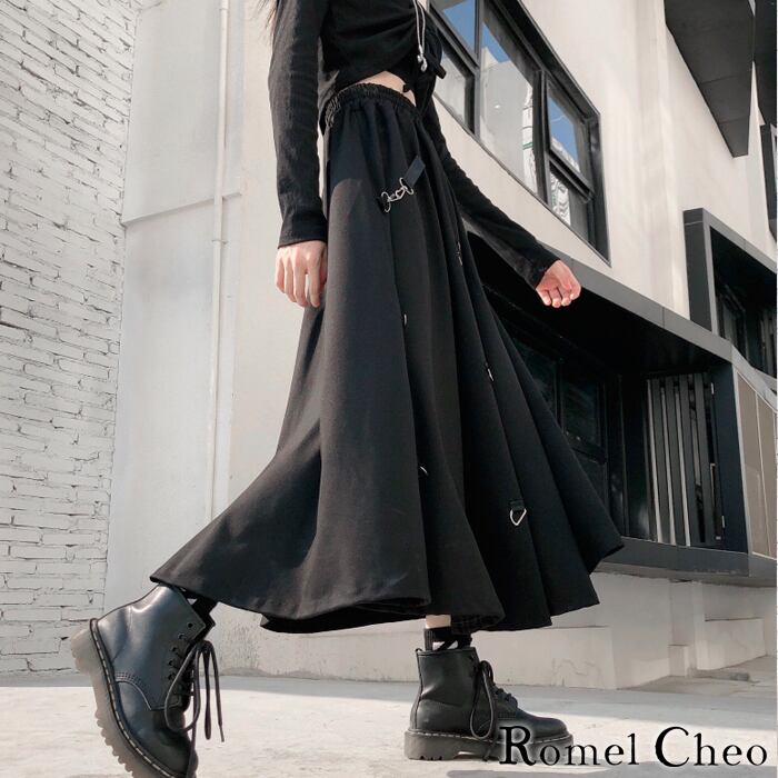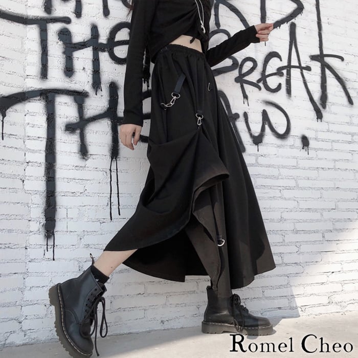 RomelCheo フック アシンメトリー スカート 黒 アシメ ロング丈 レディース aライン ウエストゴム ストリート系 ロック モード系 韓国 スタイル 個性的 カジュアル ファッション ロメルチェオ
