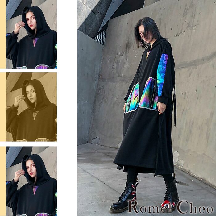 【お支払い確認後20日以内発送】 RomelCheo マキシ丈ストリートパーカー プルオーバー オーバーサイズ ビッグサイズ ワンピース ワンピ 長袖 カジュアル 個性的 ゴスロリ モード ストリート系 原宿系 レディース 青文字系 ファッション ロメルチェオ
