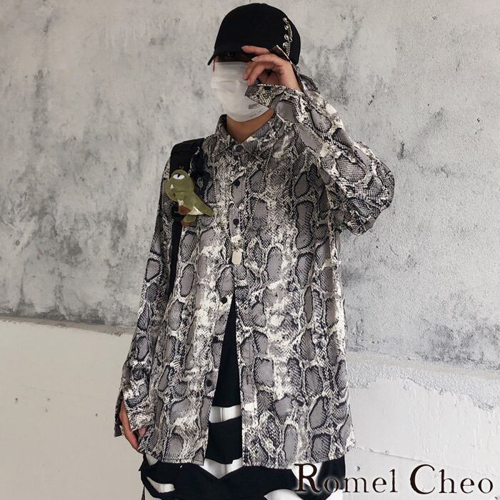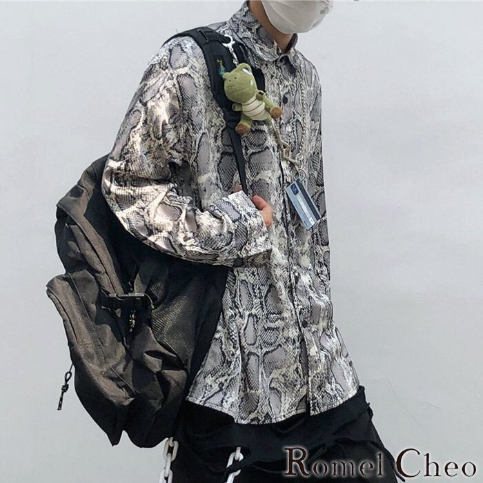 RomelCheo パイソン柄シャツ ヘビ柄 オーバーサイズ ビッグシルエット 長袖 羽織 メンズ モード ストリート カジュアル パンク ロック ファッション 個性的 韓国 原宿系 カジュアル ロメルチェオ