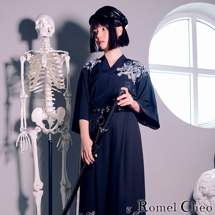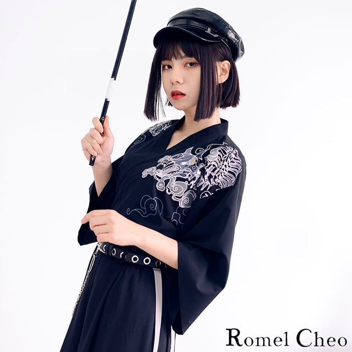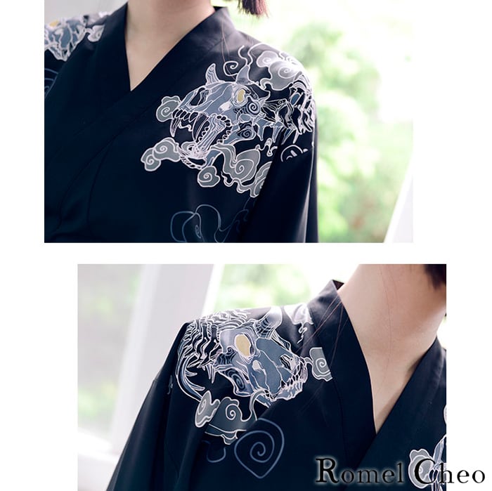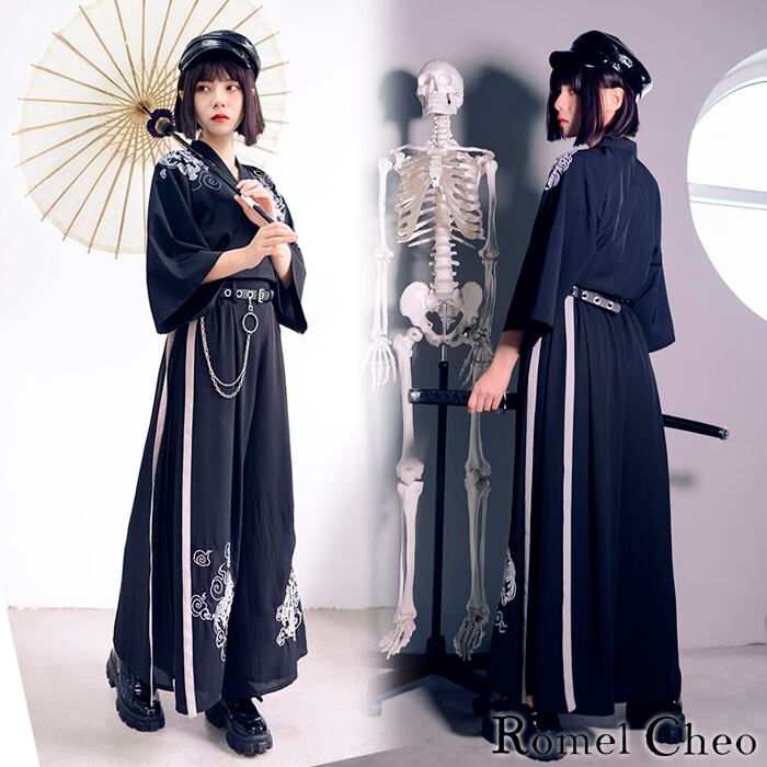 RomelCheo 妖怪 和風 シャツ 和柄 モダン 着物 プリント モノトーン レディース レトロ ストリート系 モード系 原宿系 コスプレ 侍 エスニック アジアン ファッション 青文字系 病みかわいい 個性的 個性派 ロメルチェオ
