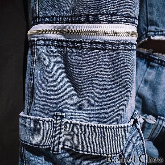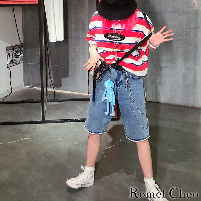 RomelCheo ジップ 2way デニム パンツ ジーンズ ハーフ 5分丈 ロング ルーズ 半ズボン スリット ファスナー ゆったり ボーイフレンド ストリート系 カジュアル ファッション ロメルチェオ