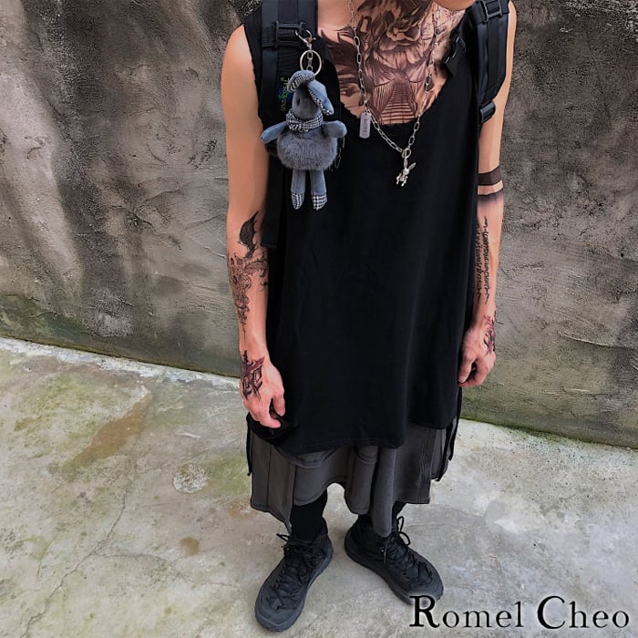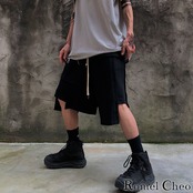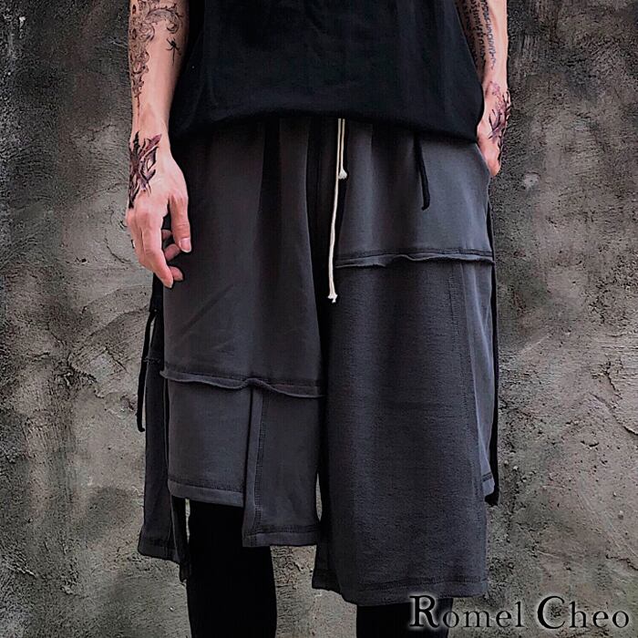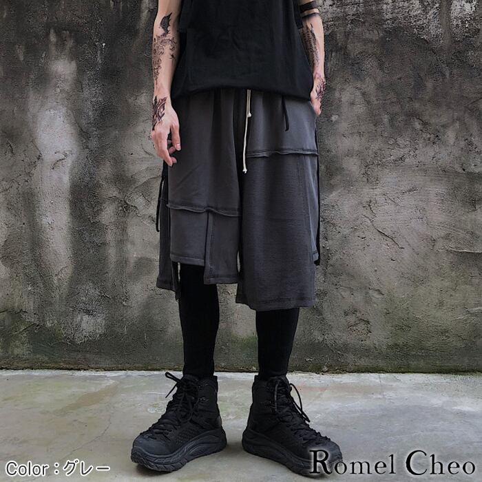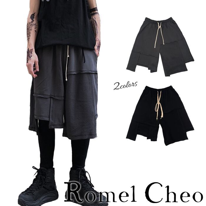 RomelCheo リメイク風 アシメ ハーフ パンツ アシンメトリー ショート イージー 短パン メンズ レディース ユニセックス 夏 5分丈 ゆったり 古着風 ストリート系 モード系 スケーター カジュアル ファッション ロメルチェオ