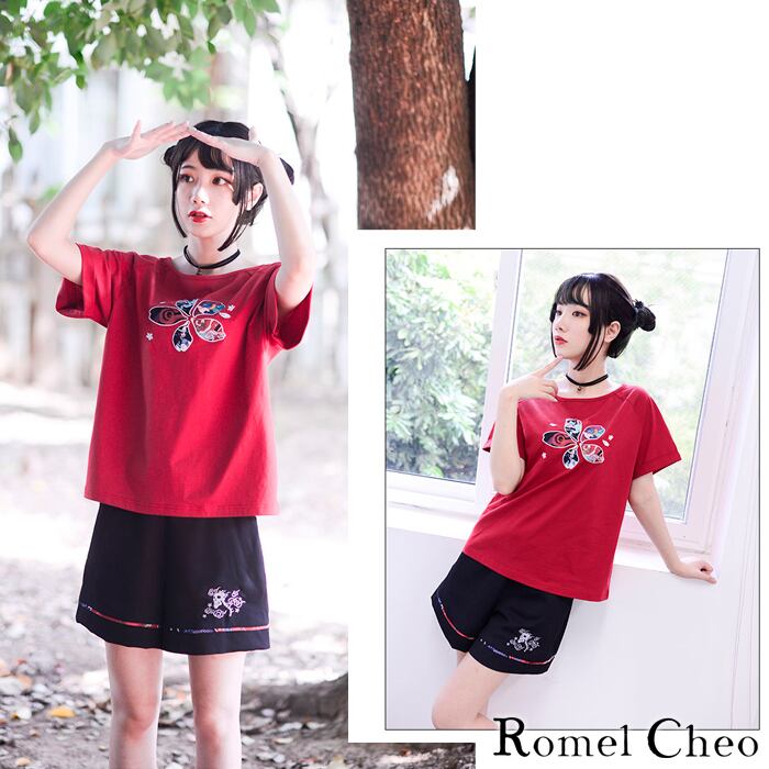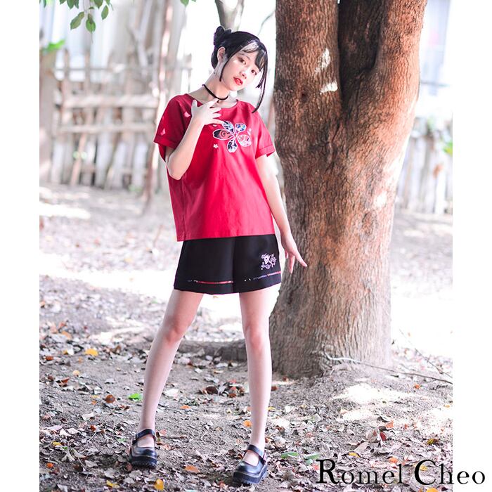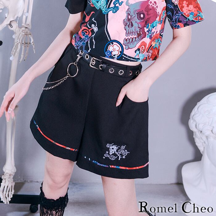 RomelCheo 妖怪 百鬼夜行 ショート パンツ ワイド 短パン リボン 和柄 プリント レディース レトロ ストリート系 原宿系 エスニック アジアン ファッション 青文字系 病みかわいい 個性的 個性派 ロメルチェオ