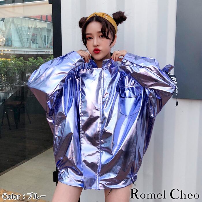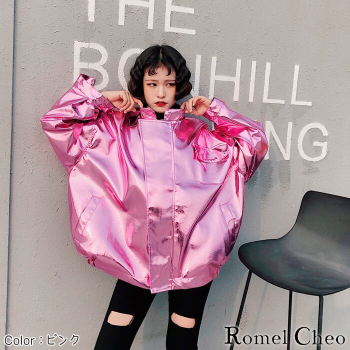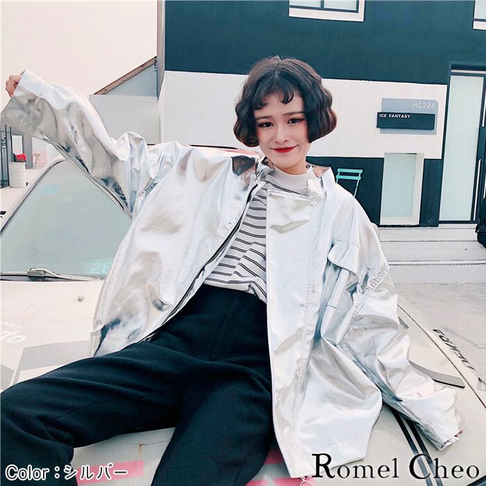 【お支払い確認後20日以内発送】 RomelCheo メタリックカラー ビッグシルエット ジャンパー レディース ブルゾン アウター ジャケット MA-1 ストリート 全3色 光沢 個性的 派手 原宿系 シルバー 銀 ゆったり スタジャン スポーツmix ロメルチェオ