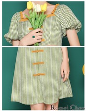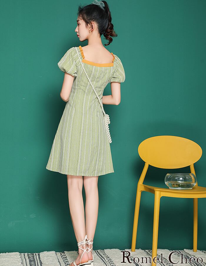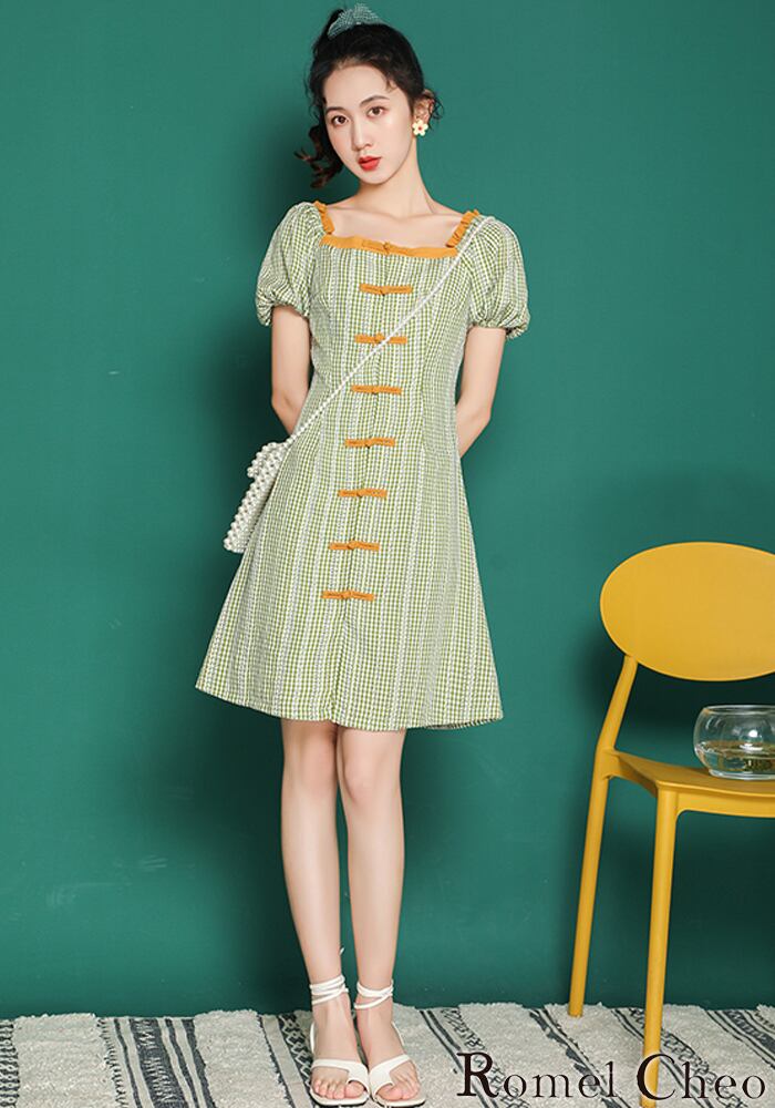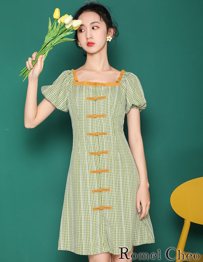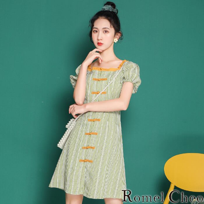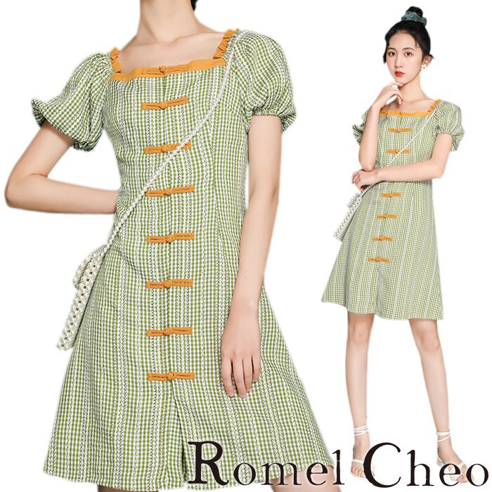RomelCheo バルーンスリーブチェックチャイナワンピ チャイナドレス チャイナボタン ワンピース カジュアル パフスリーブ Aライン 半袖 膝上丈 スクエアネック アジアン エスニック 民族風 原宿系 青文字系 ゆめかわ ロリータ レディース モード系 ファッション ロメルチェオ