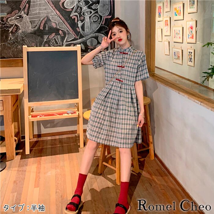 【お支払い確認後20日以内発送】 RomelCheo グリーン チェック チャイナ ワンピース レディース 半袖 キャミソール キャミワンピ 膝丈 ロング チャイナボタン 原宿系 ガーリー 森ガール カジュアル ファッション エスニック アジアン ロメルチェオ