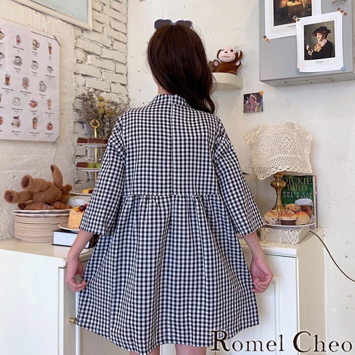 RomelCheo イラストギンガムチェックチャイナミニワンピ チャイナドレス チャイナボタン ワンピース カジュアル Aライン 5分袖 ゆったり ミニ丈 アジアン エスニック 民族風 原宿系 青文字系 ゆめかわ ロリータ ファッション ロメルチェオ