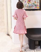 【お支払い確認後20日以内発送】RomelCheo 綿麻フレアチェックワンピース フレアスリーブ シフォン袖 チャイナドレス チャイナボタン ワンピース フレア裾 ミモレ丈 カジュアル アジアン エスニック 民族風 原宿系 青文字系 ゆめかわ ロリータ ファッション ロメルチェオ