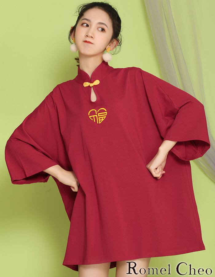 RomelCheo ワンポイントチャイナミニワンピ チャイナドレス チャイナボタン ワンピース カジュアル Aライン 5分袖 シャツワンピ プルオーバー ゆったり ミニ丈 アジアン エスニック 民族風 原宿系 青文字系 ゆめかわ ロリータ ファッション ロメルチェオ
