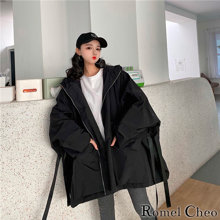 【お支払い確認後20日以内発送】RomelCheo ウルトラ ビッグ ウインドブレーカー 黒 ビッグシルエット オーバーサイズ ウエスト絞り 2way ドルマン パーカー 中綿 防寒 アウター コート ジャンパー ルーズ ゆったり ジップアップ ミドル丈 大人可愛い ロメルチェオ