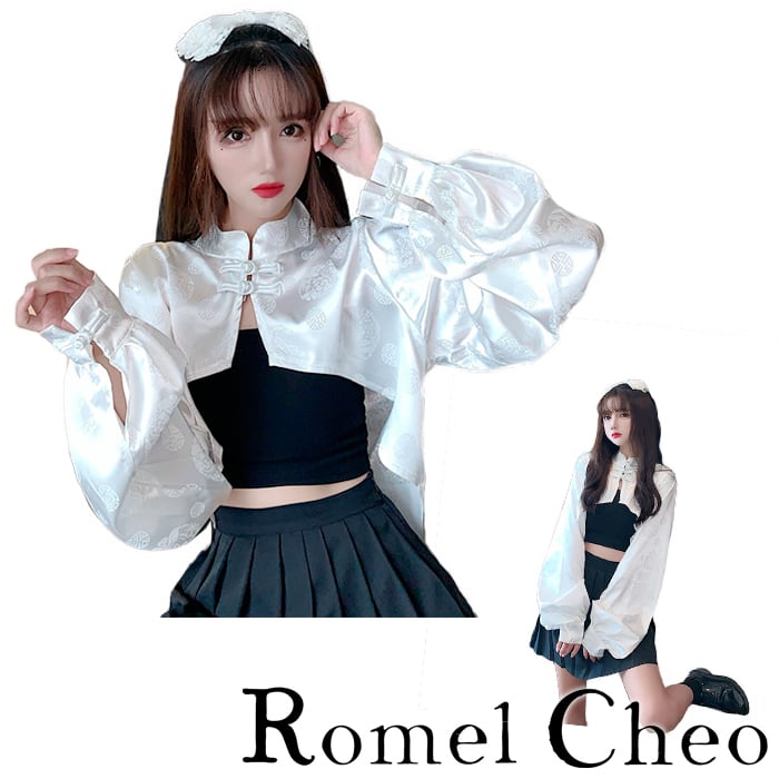 【お支払い確認後20日以内発送】RomelCheo テールカット チャイナシャツ ジャケット フィッシュテール 変形 ショート シャツ 白 チャイナボタン サテン 光沢 ボリューム袖 個性的 個性派 原宿系 青文字系 アジアン エスニック 民族風 ファッション ロメルチェオ