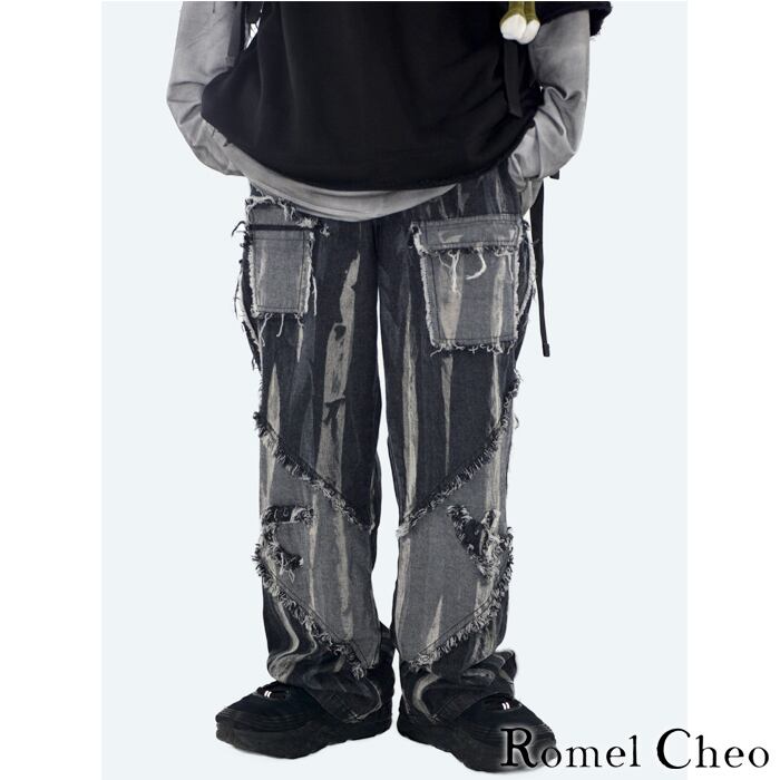 【お支払い確認後20日以内発送】RomelCheo リメイク風 ダメージ加工 ジーンズ ジーパン gパン デニム パンツ ストレート 古着風 切替 メンズ 個性的 個性派 レトロ こなれ感 韓国 服 原宿系 ストリート系 カジュアル ファッション ロメルチェオ