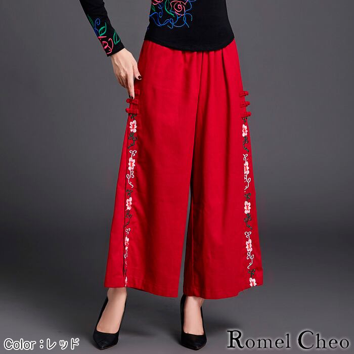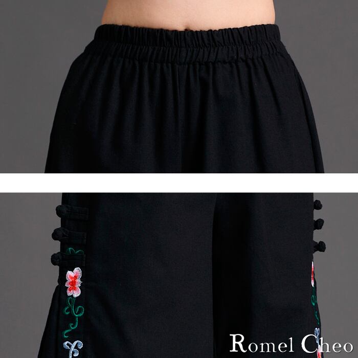 【お支払い確認後20日以内発送】RomelCheo エスニック サイド ワイド パンツ ガウチョ チャイナボタン 民族風 刺繍 花柄 レディース 綿麻 アジアン ファッション ウエストゴム 中華風 チャイナ風 漢服 レトロ 大人可愛い ロメルチェオ