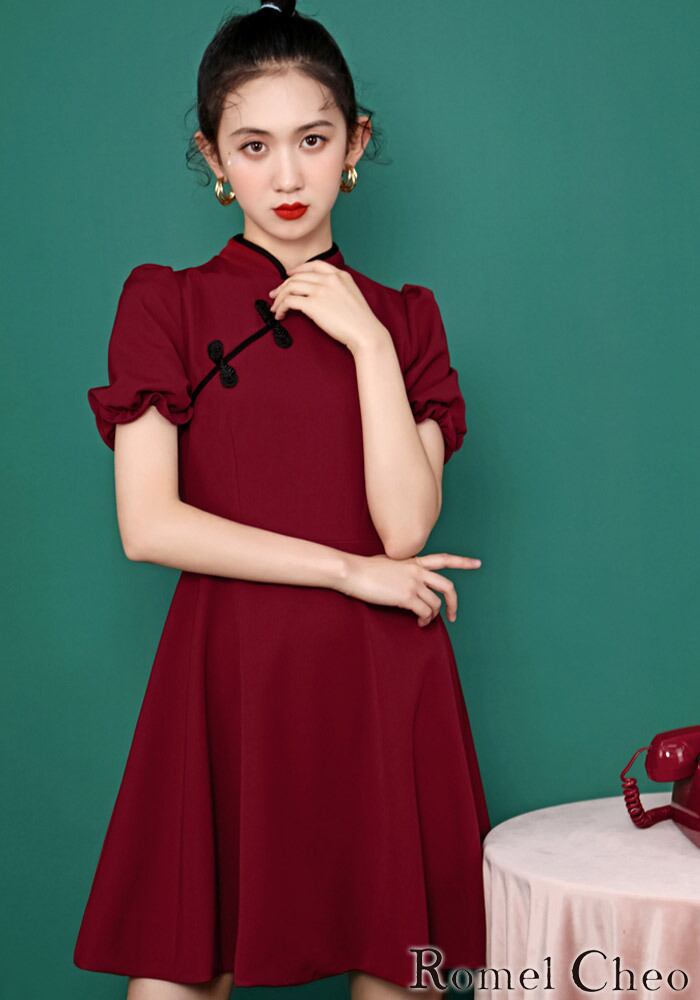 【お支払い確認後20日以内発送】RomelCheo メルヘンスリーブワインチャイナワンピース チャイナワンピ チャイナドレス チャイナミニドレス チャイナボタン 半袖 パフスリーブ ミニ丈 アジアン エスニック 民族風 原宿系 青文字系 ゆめかわ ロリータ レディース モード系 ファッション ロメルチェオ