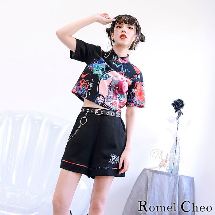 【お支払い確認後20日以内発送】RomelCheo 妖怪 百鬼夜行 ショート シャツ 和柄 プリント レディース レトロ ストリート系 原宿系 エスニック アジアン ファッション 青文字系 病みかわいい 個性的 個性派 ロメルチェオ