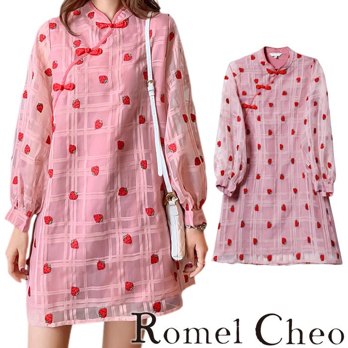 【お支払い確認後20日以内発送】RomelCheo ストロベリー刺繍チャイナミニワンピ チャイナワンピ チャイナドレス チャイナミニドレス チャイナボタン Aライン ボリューム袖 長袖 総柄 ミニ丈 民族風 原宿系 青文字系 ゆめかわ 病みかわ ロリータ レディース モード系 ファッション ロメルチェオ