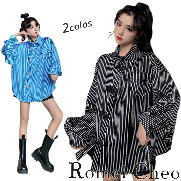 【お支払い確認後20日以内発送】RomelCheo ストライプチャイナボタンシャツ チャイナ服 チャイナボタン ブラウス 長袖 ゆったり ダボシャツ ボーイフレンドシャツ アジアン エスニック 民族風 原宿系 青文字系 ゆめかわ ロリータ ストリート レディース モード系 ファッション ロメルチェオ