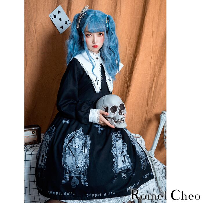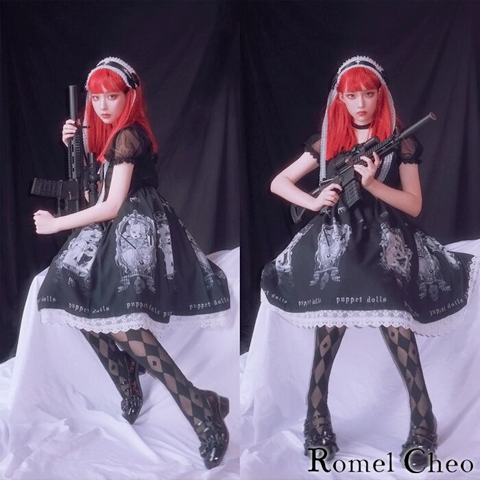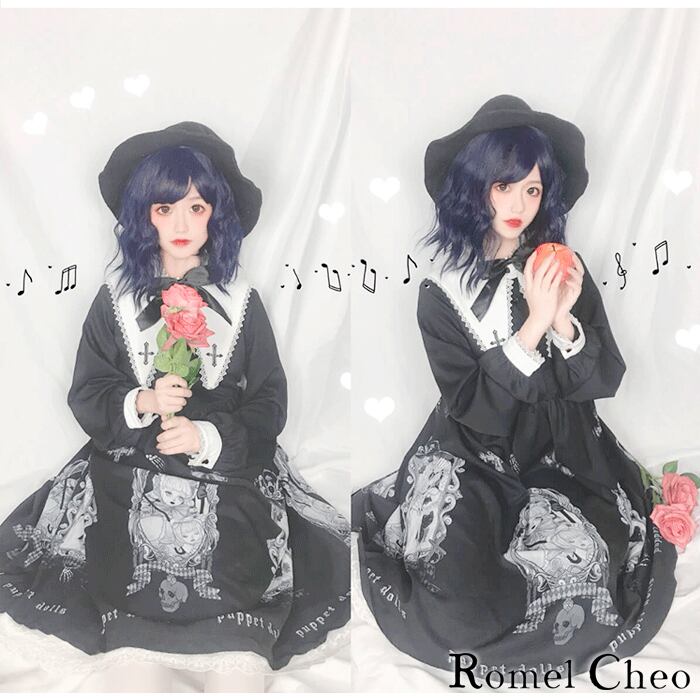 どちらもウエストリボンの黒白切替のモノトーンカラー。十字架、ドクロ、ドール柄の病み可愛いデザインとなっております。