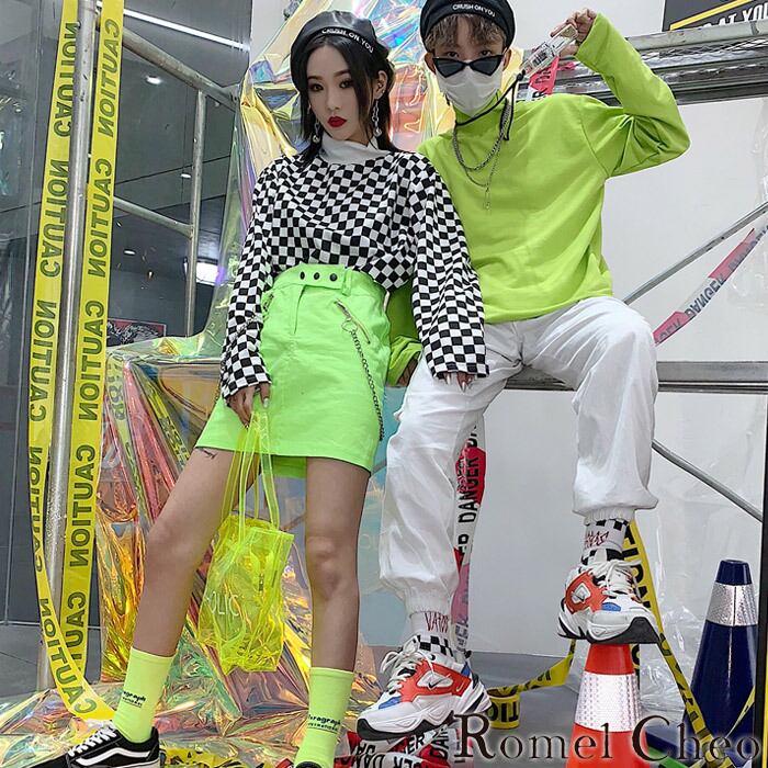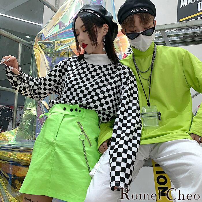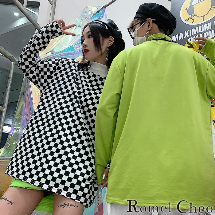 【お支払い確認後20日以内発送】RomelCheo 蛍光チェッカーフラッグハイネックTシャツ タートルネック ロンT ロングTシャツ 長袖 カットソー 総柄 無地 個性的 原宿系 青文字系 ストリート メンズ レディース モード系 ファッション ロメルチェオ