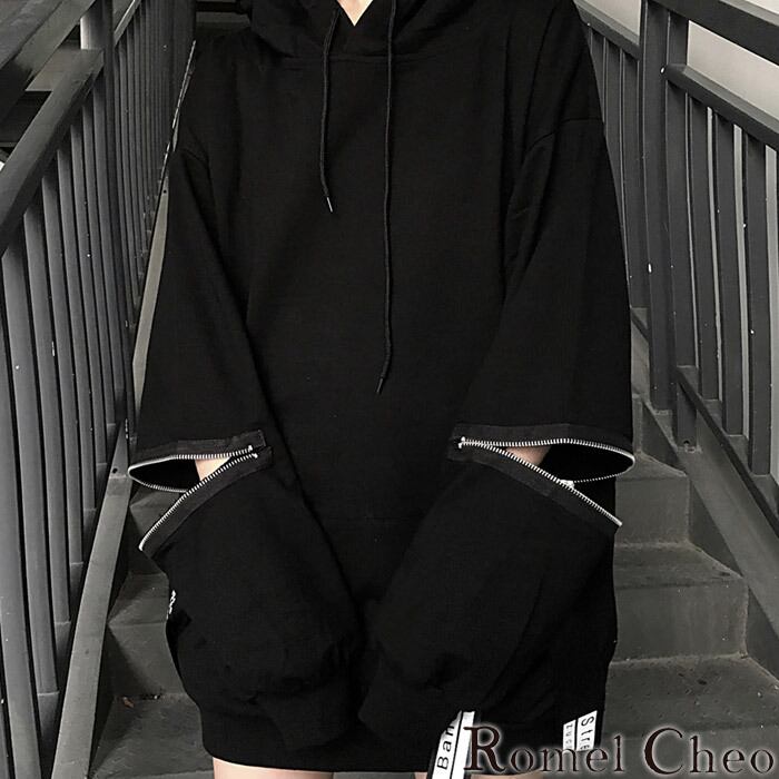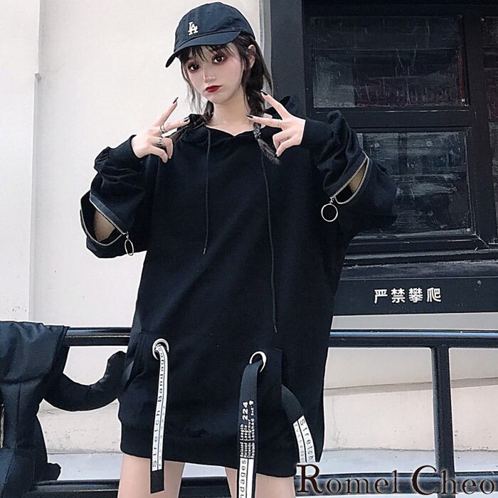 【お支払い確認後20日以内発送】RomelCheo ジップスリットリボンベルトパーカー プルオーバー オバーバーサイズ ゆったり 切り替え ジップ 変形 カジュアル 個性的 パンク ロック 原宿系 ゆめかわ 青文字系 ストリート レディース モード系 ファッション ロメルチェオ