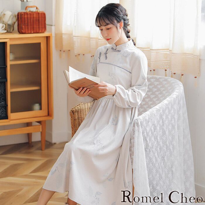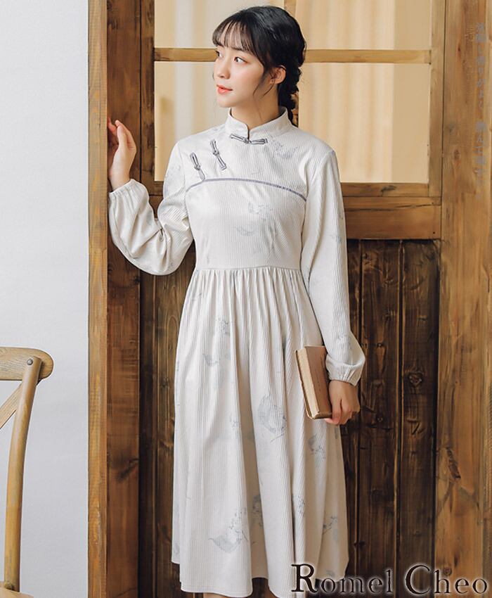 【お支払い確認後20日以内発送】RomelCheo オフホワイトグレーチャイナワンピース チャイナワンピ チャイナドレス チャイナボタン ワンピースドレス Aライン ひざ丈 長袖 アジアン エスニック 民族風 原宿系 青文字系 大人可愛い エレガント レディース モード系 ファッション ロメルチェオ