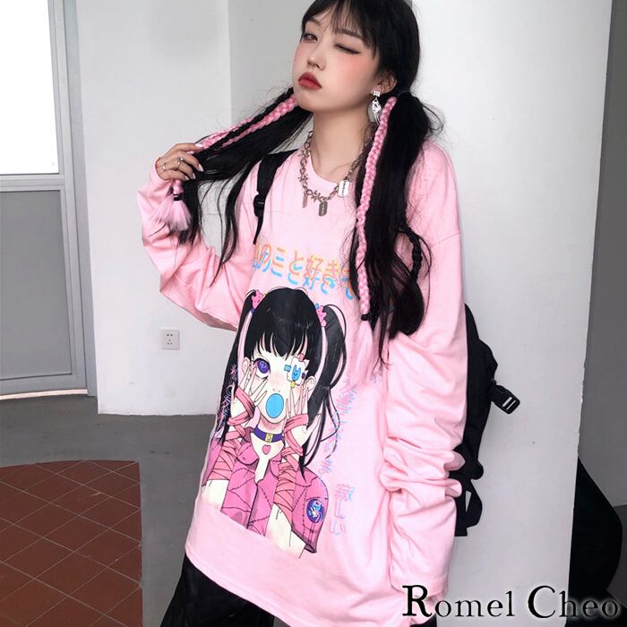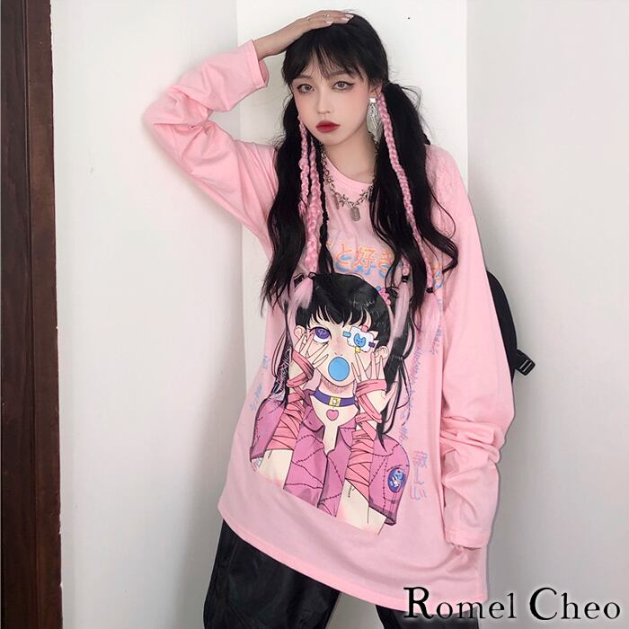 【お支払い確認後20日以内発送】RomelCheo かまってちゃん 長袖 tシャツ ロンt ロング 病みかわいい イラスト レディース 原宿系 個性的 青文字系 ガーリー メンヘラ女子 カジュアル ファッション ロメルチェオ