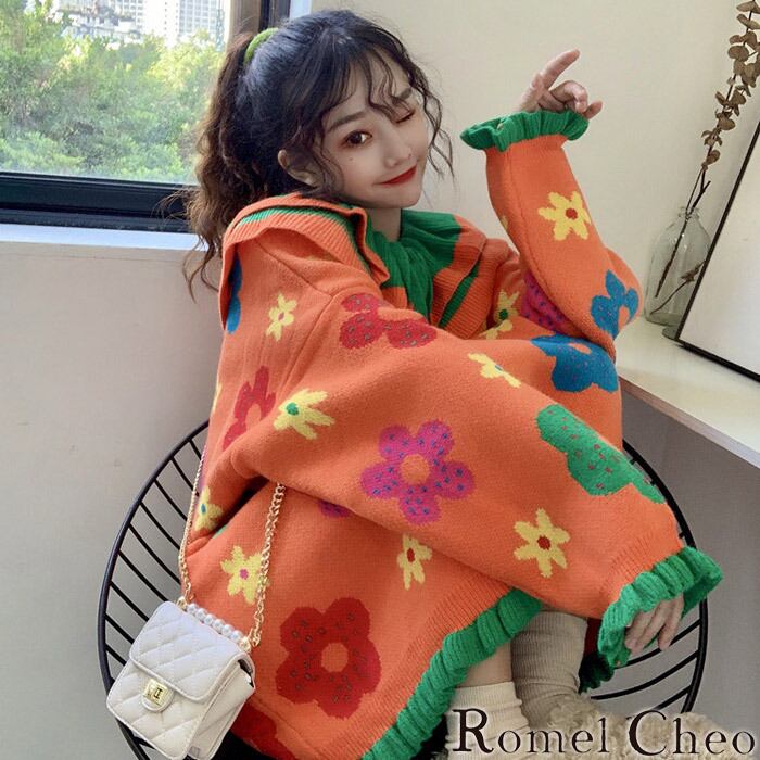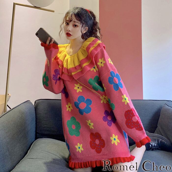 【お支払い確認後20日以内発送】RomelCheo フラワーフリルーニットワンピ 花柄 ミニワンピ ビッグシルエット ゆったり ミニ丈 長袖 個性的 ロリータ ゆめかわ 病みかわ レディース モード系 ストリート系 原宿系 青文字系 ファッション ロメルチェオ