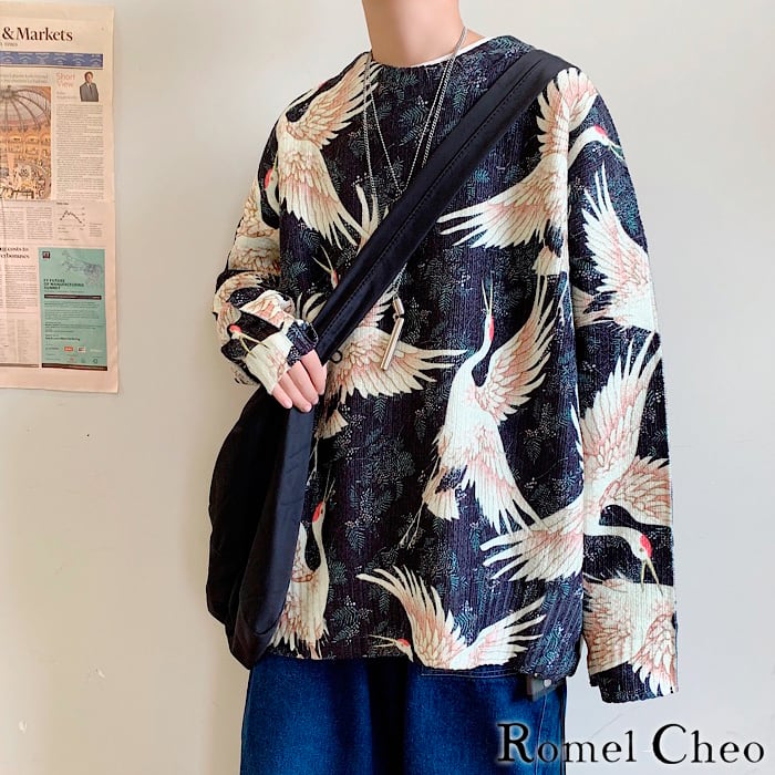 【お支払い確認後20日以内発送】RomelCheo 鶴柄 和柄 ラウンドネック ニット セーター メンズ 総柄 ゆったり アジアン エスニック 民族風 ストリート系 原宿系 カジュアル ファッション ロメルチェオ