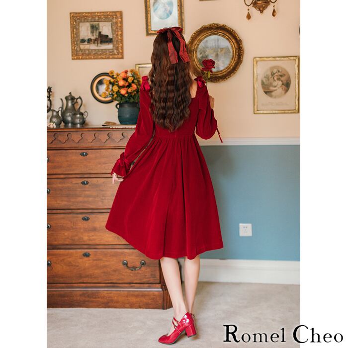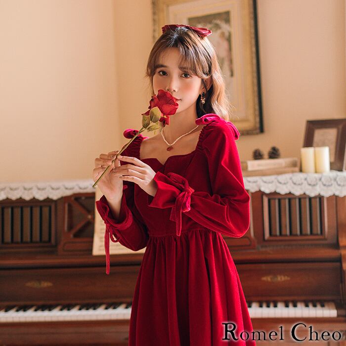 【お支払い確認後20日以内発送】RomelCheo スクエア リボン レッド ワンピース パーティー ドレス ベロア 光沢 発表会 レディース 赤 長袖 フェミニン エレガント きれいめ 大人可愛い ガーリー レトロ ファッション ロメルチェオ