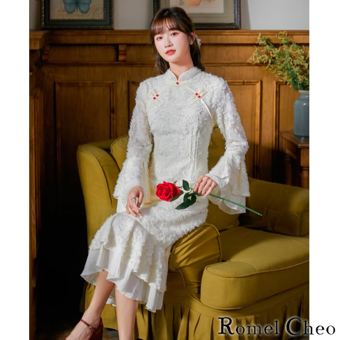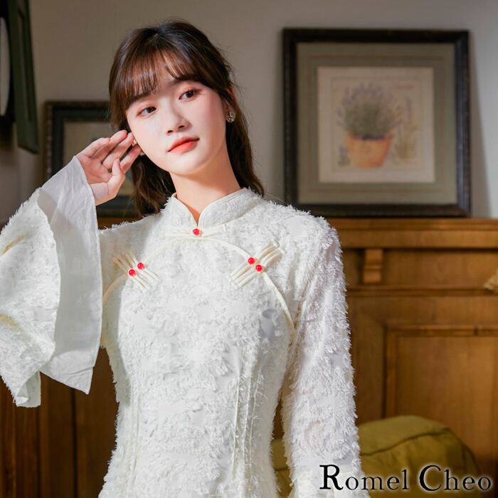 【お支払い確認後20日以内発送】RomelCheo フレンチ チャイナ ワンピース ミモレ丈 レース 裾フリル フレアスリーブ aライン ハイウエスト チャイナ風 ドレス アジアン エスニック おしゃれ フェミニン エレガント 個性的 大人可愛い ファッション ロメルチェオ