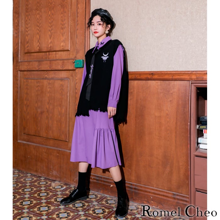 【お支払い確認後20日以内発送】RomelCheo ネクタイ付き バタフライ パープル ワンピース ロング ミモレ丈 紫 蝶 肩フリル ロゴ 刺繍 レディース 長袖 きれいめ オシャレ カジュアル ガーリー 原宿系 青文字系 レトロ ファッション ロメルチェオ