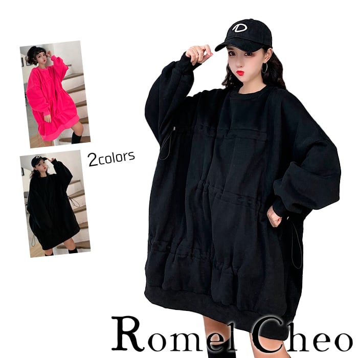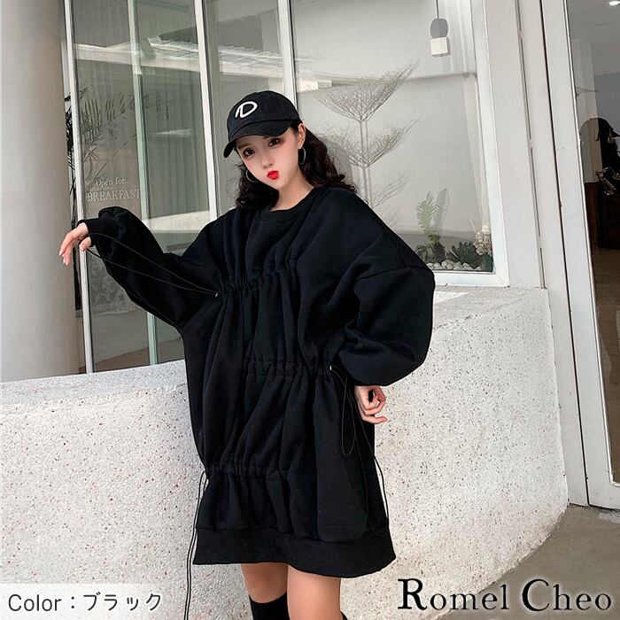 【お支払い確認後20日以内発送】RomelCheo ビッグシルエット スピンドル トレーナー ロング 裏起毛 チュニック ミニワンピ レディース 黒 長袖 絞り 変形 無地 ルーズ ゆったり 個性的 個性派 韓国 服 ストリート系 原宿系 hiphop ヒップホップ ファッション ロメルチェオ