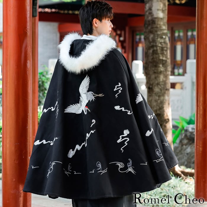 【3月7日入荷予定】RomelCheo フェイクファー フード付き 鶴柄 刺繍 マント ケープ コート 和装 和服 アウター 取り外し可能 2way 黒 和柄 メンズ レディース アジアン エスニック ストリート系 原宿系 コスプレ 衣装 ファッション ロメルチェオ