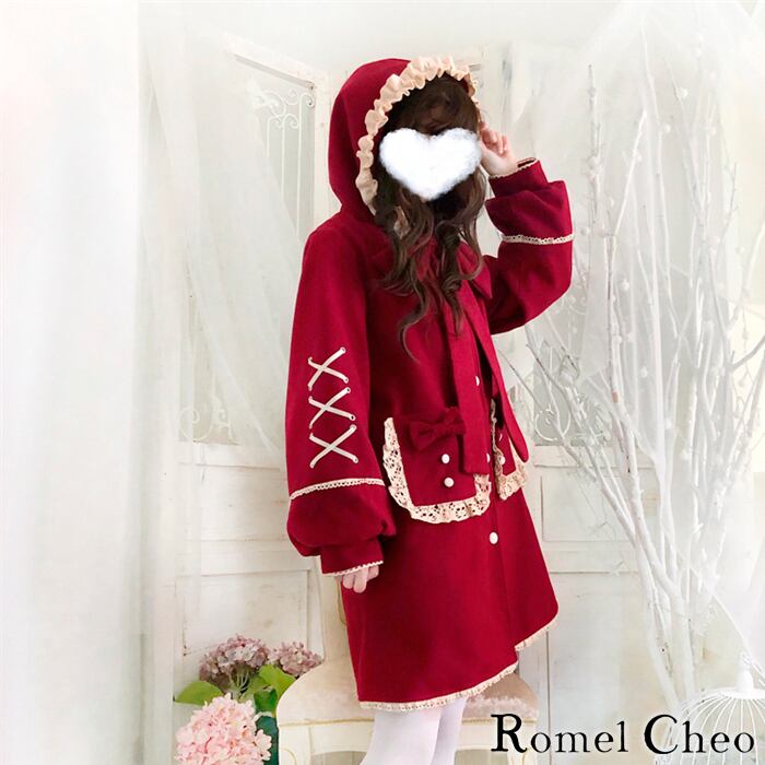 【3月7日入荷予定】RomelCheo 裏シャギー ロリータ レッド コート パーカー フリル リボン レースアップ 裏ボア 裏起毛 ボリューム袖 レディース 編み上げ 赤ずきん ロリータ 原宿系 青文字系 ガーリー メルヘン ファッション かわいい 可愛い ロメルチェオ
