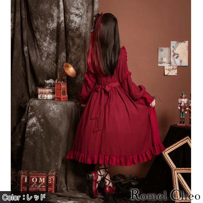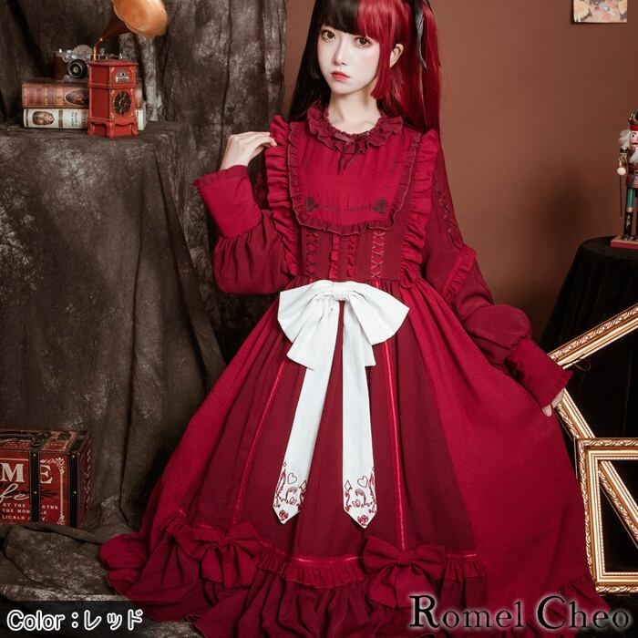 【お支払い確認後20日以内発送】RomelCheo ロリータ ローズ ハート ワンピース リボン 刺繍 フリル レディース ゴシック ドレス 黒ロリ 赤ロリ aライン 長袖 姫系 原宿系 青文字系 ガーリー エレガント ファッション ロメルチェオ