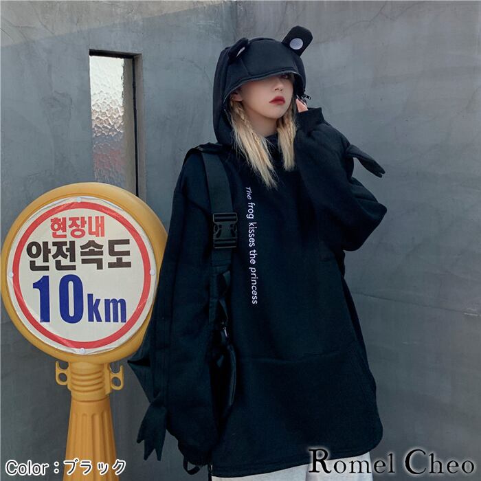 【お支払い確認後20日以内発送】RomelCheo ストリート フロッグ パーカー カエル 蛙 かえる モチーフ メンズ レディース 白 黒 フード付き トレーナー ビッグシルエット プルオーバー 個性派 個性的 原宿系 カジュアル ファション ロメルチェオ